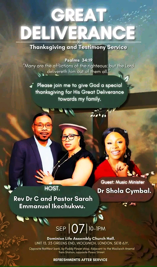 Great Deliverance Service – Sept 2025 September 1, 2025October 14, 2025394 Thanksgiving and Testimony service on September 7th, 2025. Time: 10am to 1.00pm, Guest Music Minister: Dr Shola Cymbal. Venue: Unit 13, 23 Greens End, Woolwich, London, SE18 6JY Opposite Natwest Bank, By Paddy Power Shop