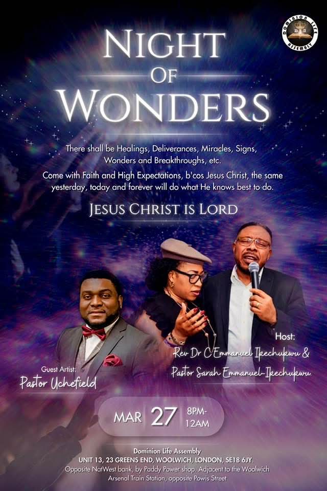 Night of Wonders – March 2026 March 20, 202613 Night of Wonders – 27th March, 2026. Time: 8pm to 12.00Am. Ministering: Rev Dr C. Emmanuel Ikechukwu and Pastor Sarah Emmanuel Ikechukwu. Guest Artist Pastor Uchefield. Click HERE To view our services YouTube